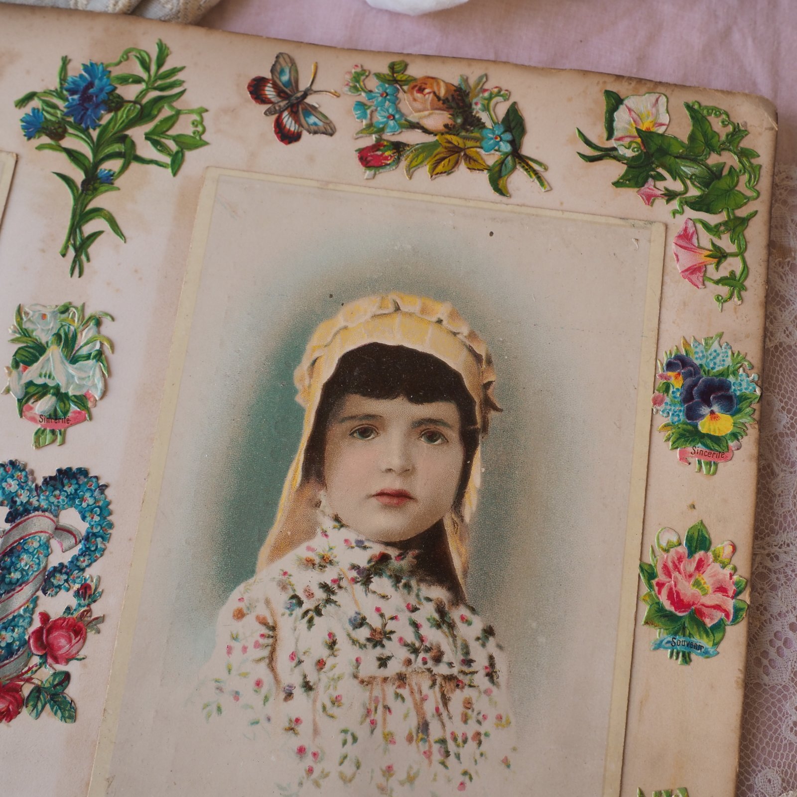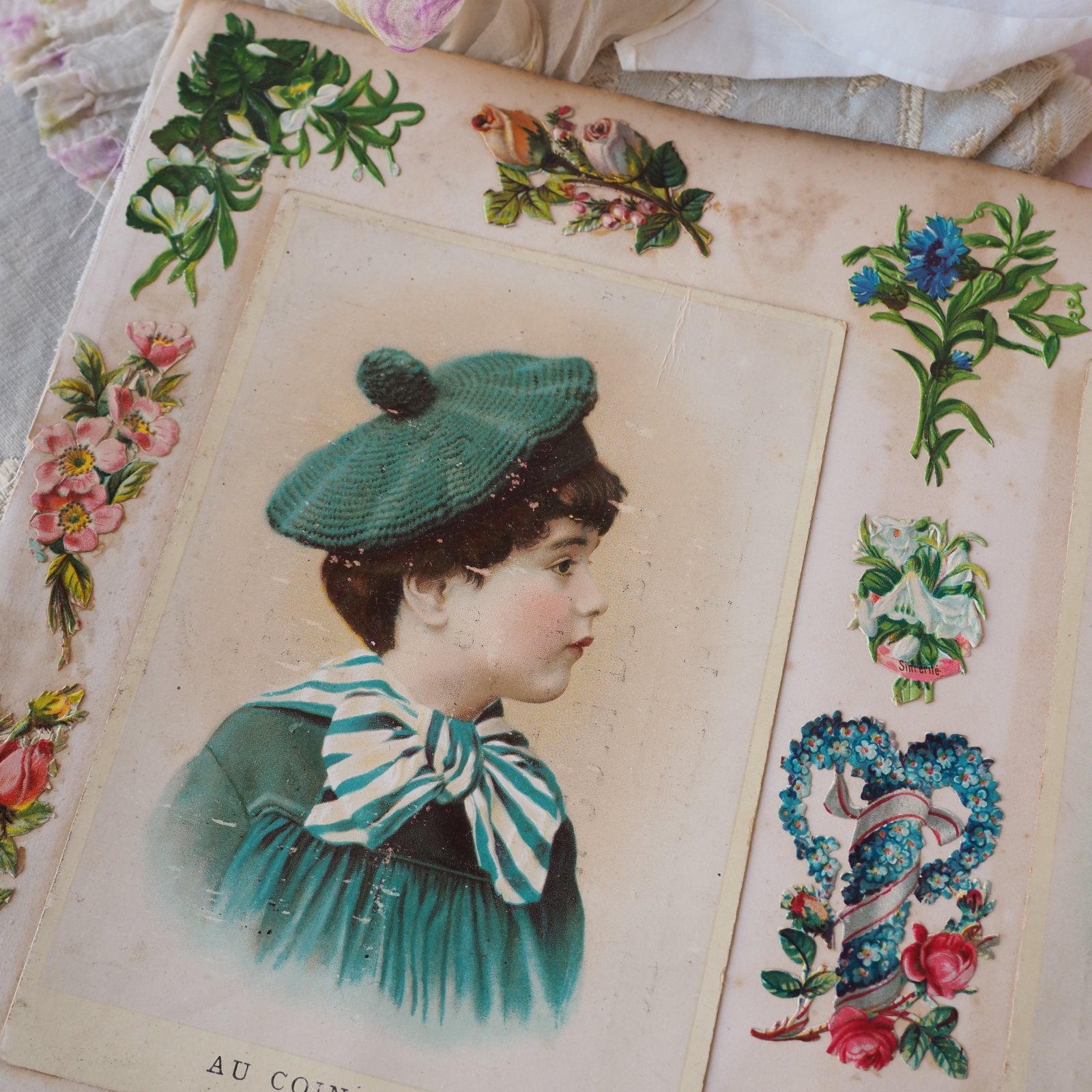 クロモカードのサンプル帳/少女の肖像画とベビー、すずらん、バラ、小花両面