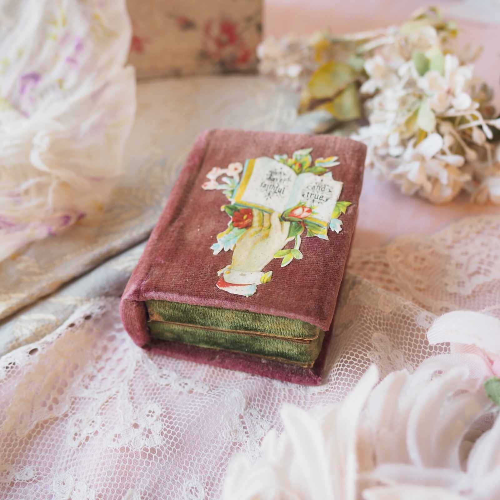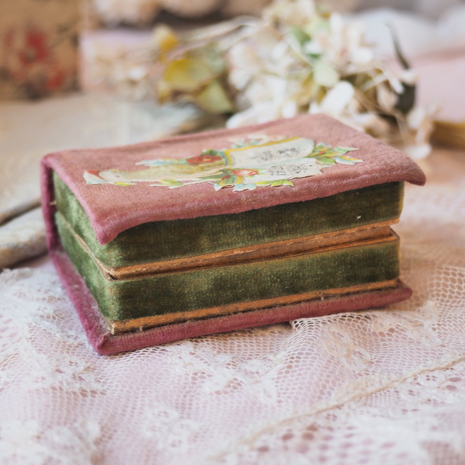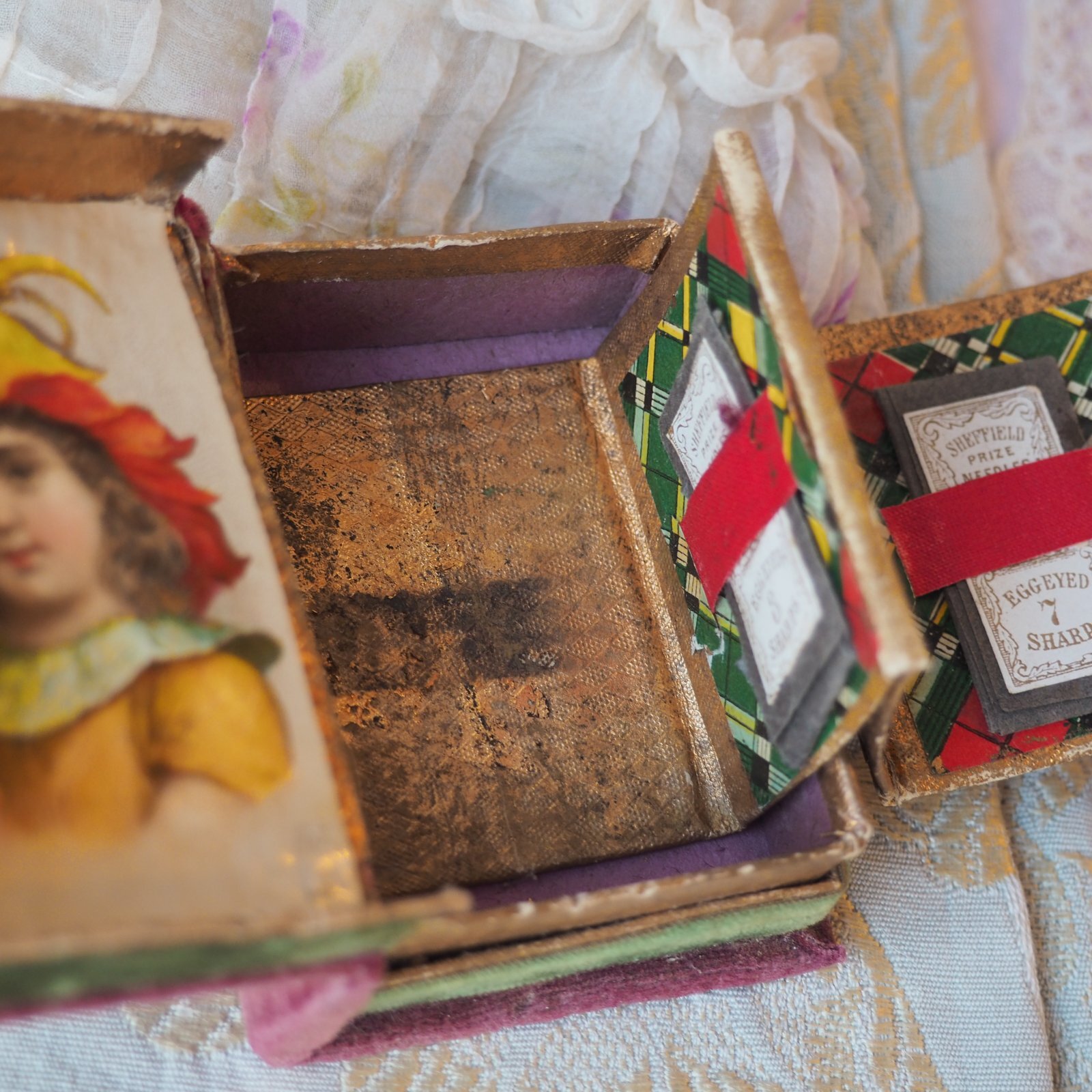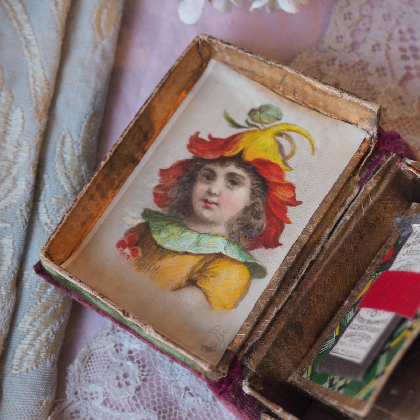 カルトナージュBOX、クロモ付き小さなbook型ニードル入れ/1880年代イギリス